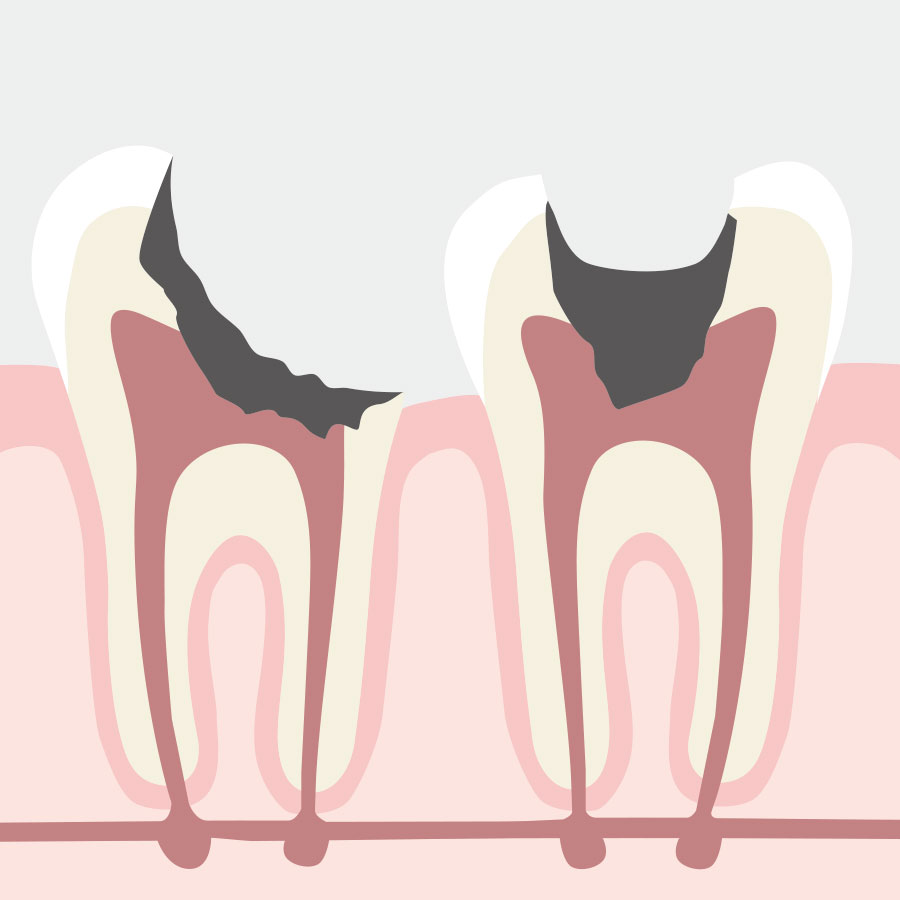 虫歯により歯のほとんどが無くなってしまっただけでなく、歯の根っこまで虫歯に侵されてしまったものを言います。こうなると歯を残すことは不可能なので、残念ながら抜いてしまうしかありません。